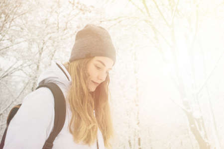 Image of pretty woman walking in snowy mountains, side view of cute girl looking up, closeup portrait of female wearing warm winter earmuff, red sunset, wintertime sports, trekking and hiking concept