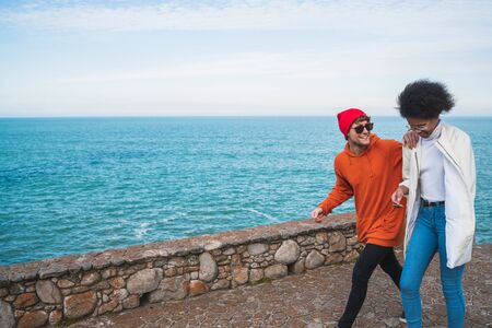 Portrait of two young friends spending some nice time together, walking on coast line and having fun.