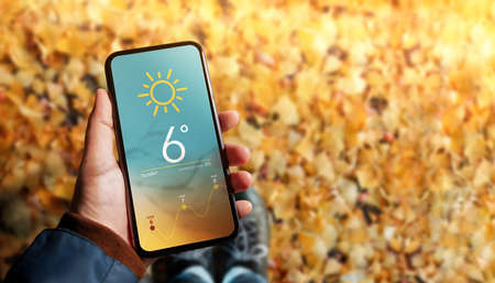 Good Weather on Sunny Day in Fall and Autumn Concept. Hand holding a Mobile Phone to see Weather Forecast Information. Yellow, Orange Foliages as background. Top View