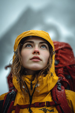 Detailed photo of a woman hiker in a yellow jacket and red backpack, set against snowy peaks. The cold air mist and cinematic atmosphere enhance the realism.