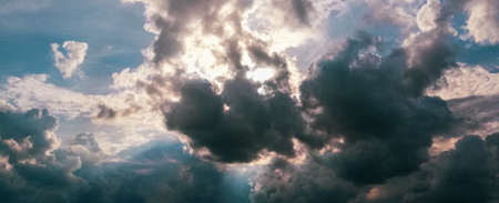Dramatic cloudscape. Sunny light through dark heavy thunderstorm clouds before rain. Overcast rainy bad weather. Storm warning. Natural blue background of cumulonimbus. Sunlight in stormy cloudy sky.