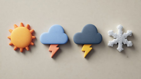 Brightly colored weather icons show the sun, clouds with rain, and a snowflake, illustrating different weather conditions on a smooth surface.