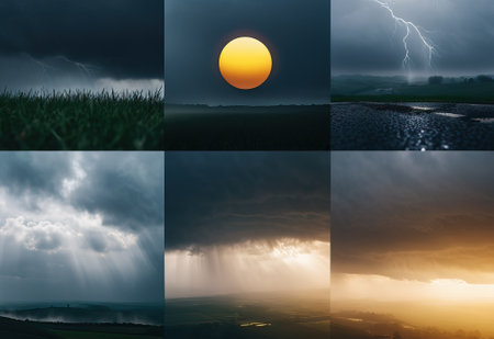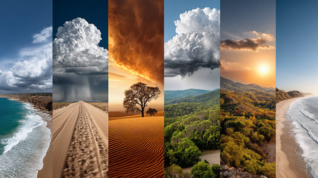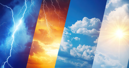 A collage of four weather patterns: lightning and thunder on the left side, a bright sun in the middle with a blue sky, a cloudless sunny day at the bottom right, and a cloudy sunset on the top right. The background is a clear blue sky with white clouds. Each section has its own unique color palette and lighting effect to represent each type of environment. A yellow light shining from the upper right corner illuminates part of one side, indicating that it is daytime. --ar 19:10 --v 6.1 Job ID: 1882e710-bd05-42b8-a166-27f4cc94d108