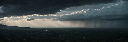 Ominous clouds loom in the sky during sunset, casting shadows and creating a captivating contrast of light and dark, signaling an approaching storm.