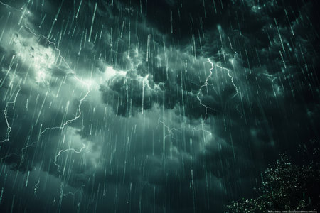 A dramatic storm with intense lightning illuminating the dark and rainy night sky.