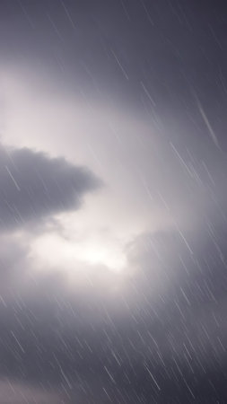 A dramatic depiction of heavy rain falling against a stormy sky. Dark, ominous clouds dominate the frame, with a bright, intense light breaking through a gap in the clouds. The rain is shown as distinct streaks, conveying a sense of intensity and the force of the weather. The overall mood is somber and powerful, highlighting the raw energy of a rainstorm.