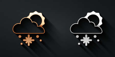 Gold and silver Cloud with snow and sun icon isolated on black background. Cloud with snowflakes. Single weather icon. Snowing sign. Long shadow style. Vector
