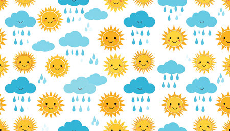 Cheerful repeating pattern of smiling suns and rain clouds on a white background. Simple cartoon style