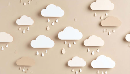 A beige background displays an arrangement of paper clouds in varying shades of off-white and beige, each with small paper raindrops falling beneath