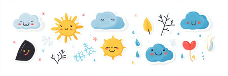 Weather-themed stickers feature a cheerful sun, cute clouds, playful raindrops, and lovely snowflakes on a bright white background.