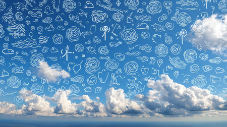 Bright blue sky filled with white clouds features numerous abstract doodles and sketches, creating a whimsical atmosphere in daylight.