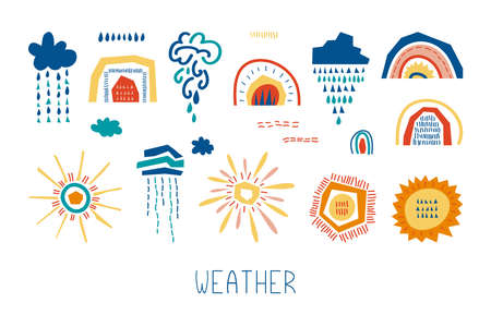 Collection of colorful flat weather elements. Vector abstract clouds, suns, rainbows, raindrops on white background