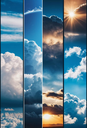 A collage of four weather scenes: lightning and thunder on the left side, a blue sky with white clouds in the center, the sun shining brightly on the right side, and a clear sky without any clouds on the bottom half of the photo. The colors are vibrant and vivid. --ar 19:10 --v 6.1 Job ID: dcd33476-7f63-4d9a-a138-bc56bca06ff9