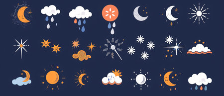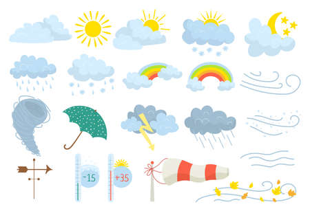 weather icons, sun, rain, snow, cloud, time, illustration of weather elements, depicting various weather conditions in a flat design style on a light background