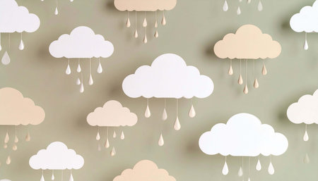 Paper clouds in off-white and beige hues, arranged in a repeating pattern against a muted green background, each cloud releasing small raindrops