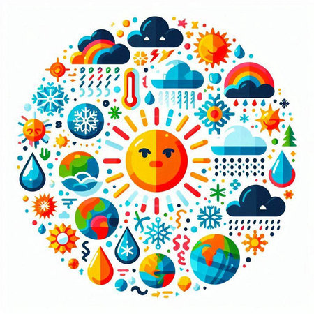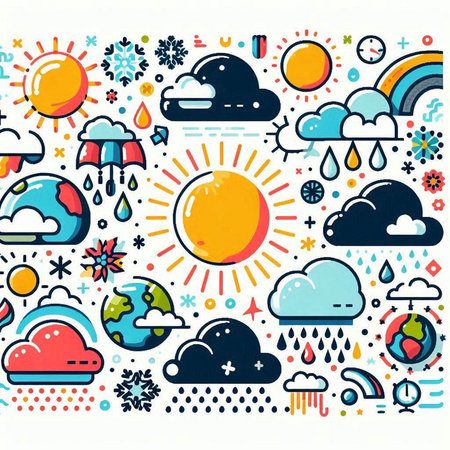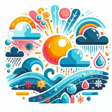 Various weather patterns are illustrated with colorful clouds, sun, and rain, creating a playful and vibrant representation of natures elements.