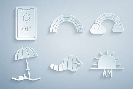 Set Cone meteorology windsock wind vane, Rainbow with clouds, Sun protective umbrella for beach, Sunrise, and Weather forecast icon. Vector