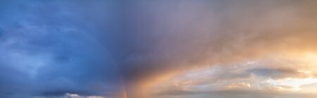 Summer sunset after rain sky panorama with fleese purple clouds and rainbow. Evening dusk good weather natural background.