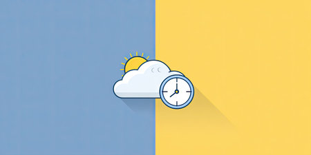 A flat design weather concept depicts a cloud, sun, and clock against a split background. The illustration uses bright yellow and blue with a long shadow effect. This graphic could be used to represent time, weather, or climate change in various commercial applications, as well as for educational purposes.