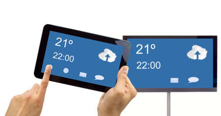 closeup of a tablet connected to a tv through wireless connection in networking. All screen content is designed by us and not copyrighted by others and created with tablet and ps
