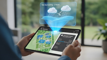 Person uses tablet with holographic garden map and rain approaching forecast displayed. Clear det...