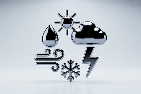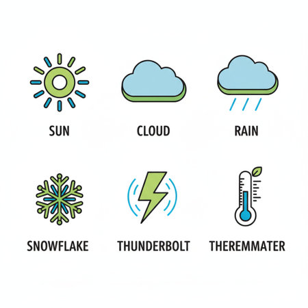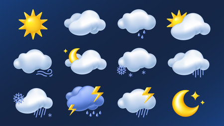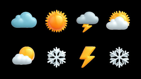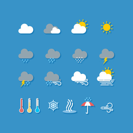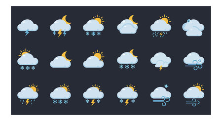 A collection of weather icons showcasing sunny, rainy, snowy, and stormy conditions in a flat design style, conveying diverse atmospheric moods.
