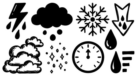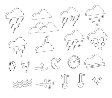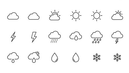 A grid of simple black outline depicting weather phenomena including sun, clouds, rain, lightning, and snowflakes on a white background.