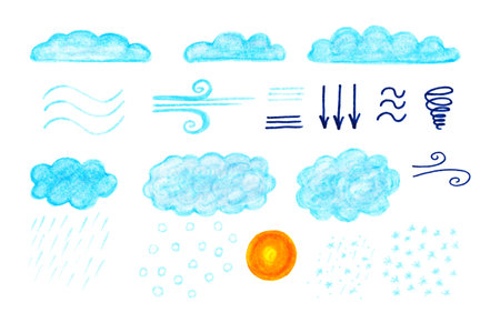 Watercolor weather forecast. Clouds, precipitation, wind. Hand-drawn weather elements isolated on white background. Nice blue clouds.