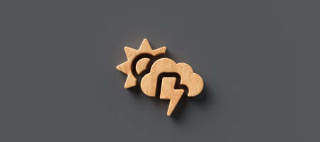 wooden symbol of a cloud with thunderbolt in front of a sun symbol on gray background - 3d illustration