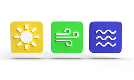 3D icons of sun, wind and water as examples of renewable energies to stop climate change. 3D rendering
