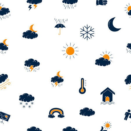 Weather Icons - sun, moon, clouds, snow, rain. Graphic modern pattern.