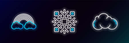 Set line Cloud, Rainbow with clouds and Snowflake icon. Glowing neon. Vector