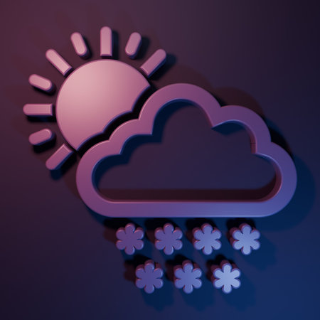 Purple Cloud with snow and sun icon isolated on purple-blue background. Cloud with snowflakes. Single weather icon. Snowing sign. Minimalism concept. 3D render illustration.