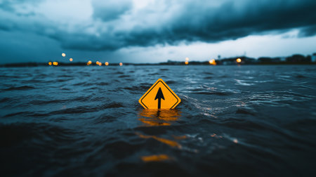 A yellow road sign partially submerged in floodwaters, surrounded by dark clouds and distant lights, evokes sense of urgency and caution