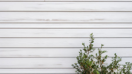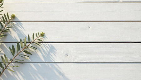 White wooden planks background with green branch element