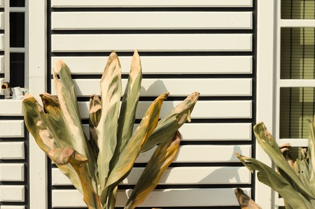 Green plant leaves in the foreground cast sharp, distinct shadows against a light-colored siding wall. The bright sunlight creates a high-contrast, abstract pattern of nature against the architectural texture.