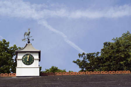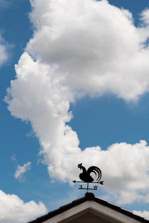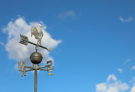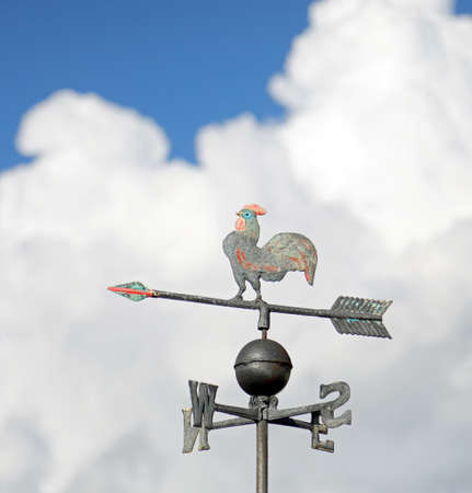 A vintage cockerel wind vane showing the wind direction against a blue sky with clouds.