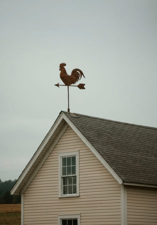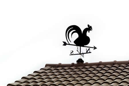 Rooster weathervane on top of a rural house roof showing direction against a gray sky. Agriculture and weather concept.
