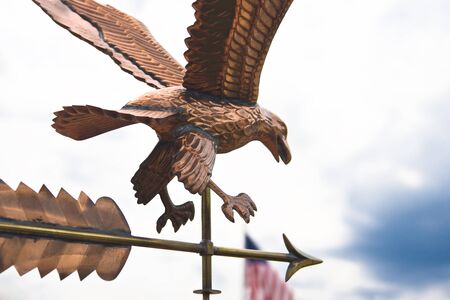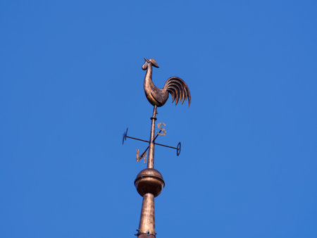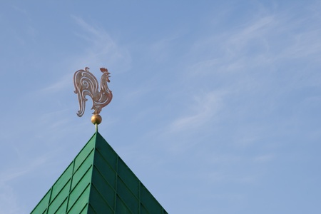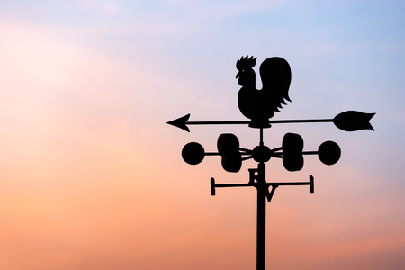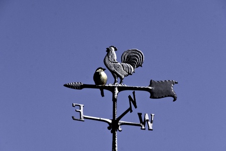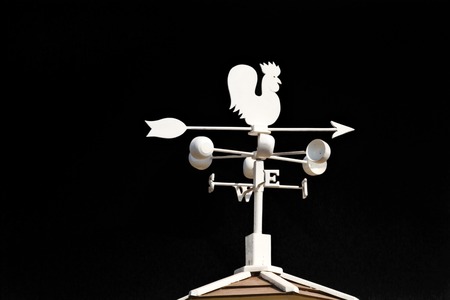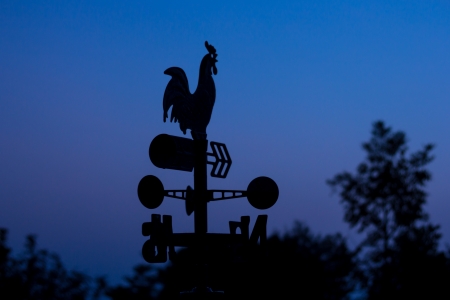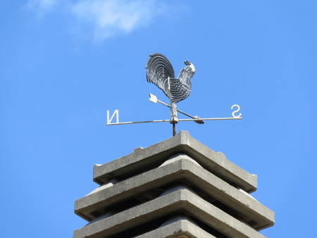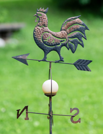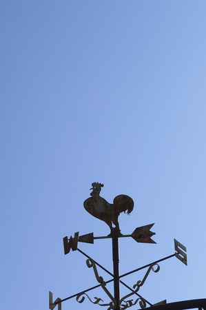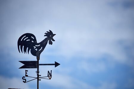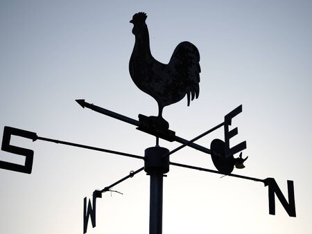 Rooster weather vane on a rooftop with an arrow and North-South pointer to show the direction of the wind against a hazy blue sky, vintage style