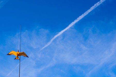 Colorful weathervane is standing against a blue sky, showing the wind direction