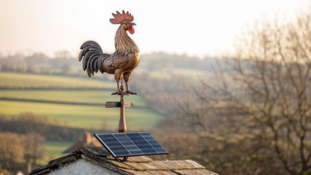 Weathervane solar panel. Decorative metal rooster weathervane mounted above a small solar panel on rustic roof with scenic countryside landscape in background.
