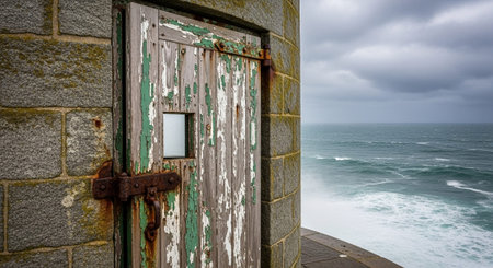 Dramatic seascape with dark stormy sky and rain