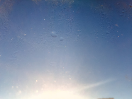 Blurry natural water drops on sunshine frozen window glass background surface, closeup