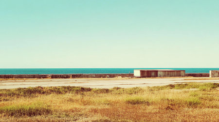 A serene coastal landscape showcasing a bright blue ocean under a clear sky. The foreground features vibrant green grassland, creating a calming and tranquil environment.