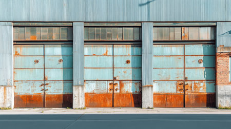 A striking image of a weathered industrial warehouse showcasing rusty doors against a blue metal facade, illustrating urban decay and charm.