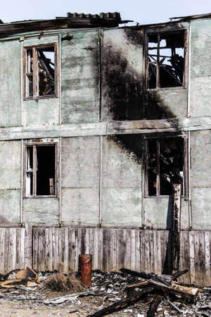 Fire arson factory warehouse building burned damaged close-up detail economy business industry unemployment poltical atmosphere.