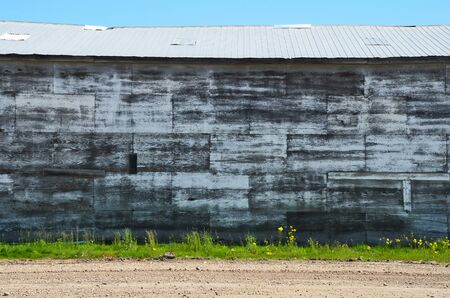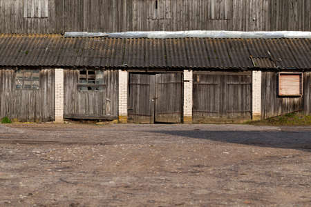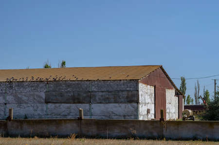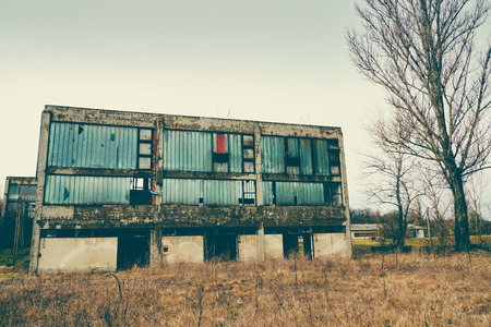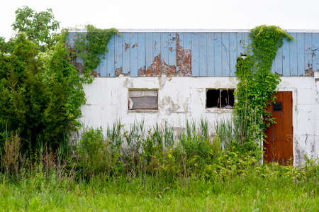 Abandoned barn in weed yard. Cracks in brick walls. Apocalyptic background.