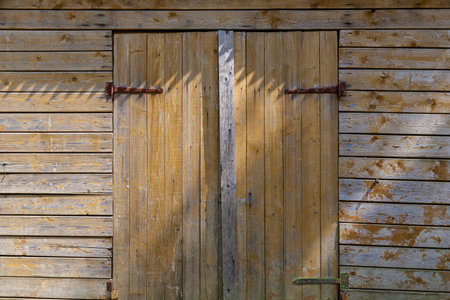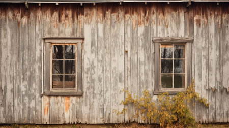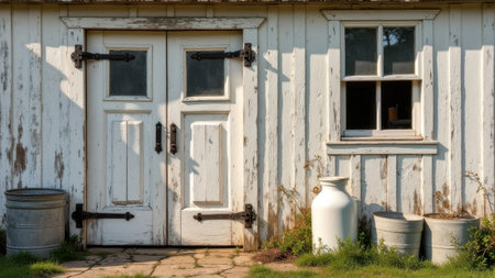Rustic wooden shed with weathered doors and vintage milk cans in countryside setting. That the image is generated using AI.