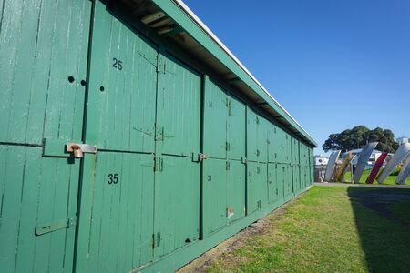 Auckland New Zealand - Green dinghy lockers of Devonport foreshore.