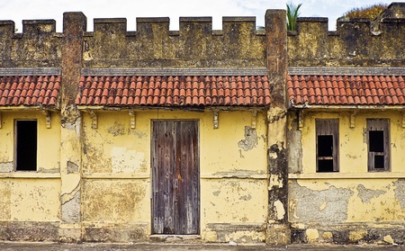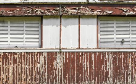 Abandoned, weathered building with peeling paint and ample sky for copy. No signs of life